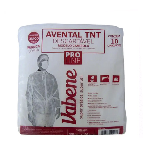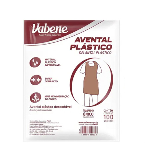 Avental descartável Vabene produzido em TNT, ideal para uso em ambientes que exigem higiene e proteção. Tamanho 110x70cm, pacote com 100 unidades.