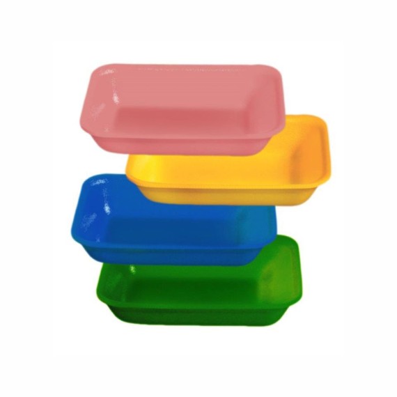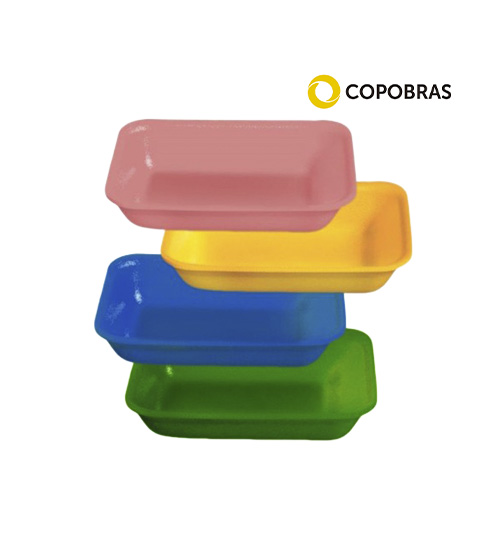Bandejas de isopor da marca Copobras, disponíveis nas cores amarela, preta e rosa, nos modelos N2, N3 e N4. Produzidas em ABS, ideais para uso comercial e alimentício.