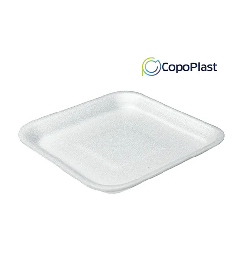 Bandejas de isopor da marca Copoplast, modelos CR-04 e CR-05, formato raso. Produzidas em material leve e resistente, ideais para exposição de alimentos.