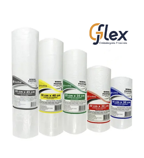 Bobina picotada GW Flex, indicada para uso comercial. Medidas: 20×30, 25×35, 30×40, 35×45, 35×50, 40×60, 50×70 e 60x90cm.