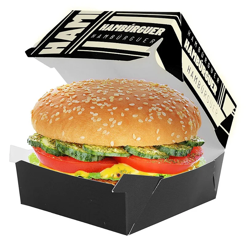 Caixa para hambúrguer gourmet na cor preta, resistente e moderna. Vendida em unidade ou pacote com 50 unidades.