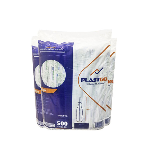 Canudos Plastgel longos disponíveis em pacotes com 100 ou 500 unidades, e caixas com 6×500 ou 30×100 unidades.