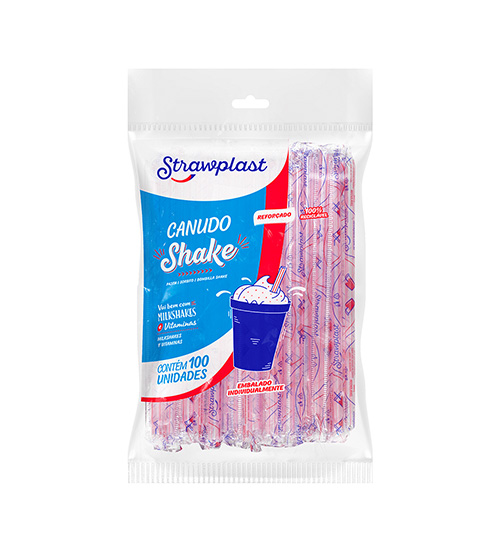 Canudo Plastgel Shake 8mm, ideal para milkshakes, disponível em pacote com 100 unidades ou caixa com 20 pacotes.