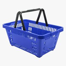 Cesta plástica para supermercado, disponível em diversas cores: azul, laranja, preta e verde.