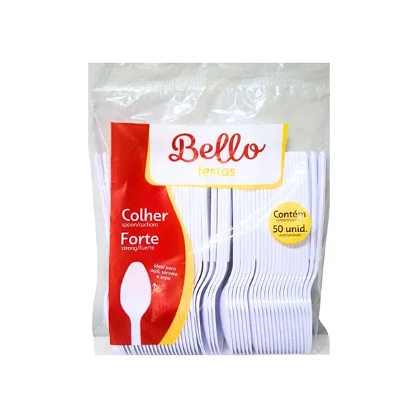 Colher Forte Bello Festa, nas cores branca ou cristal, disponível em pacotes com 50 unidades ou caixas com 10 pacotes.