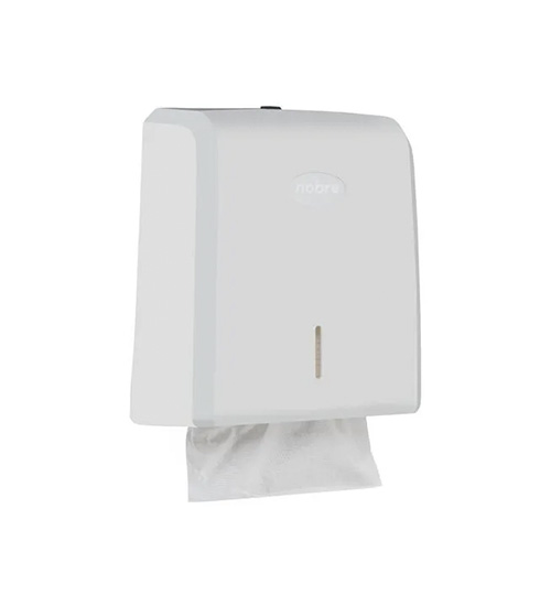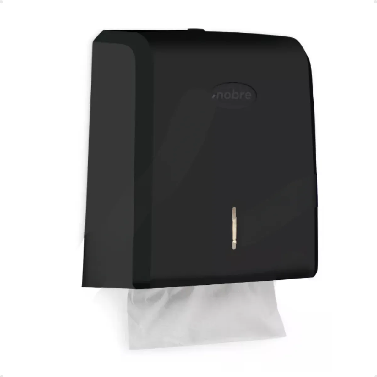 Dispenser autocortante para papel toalha, nas cores branca e preta.