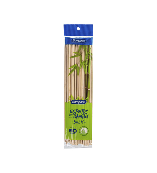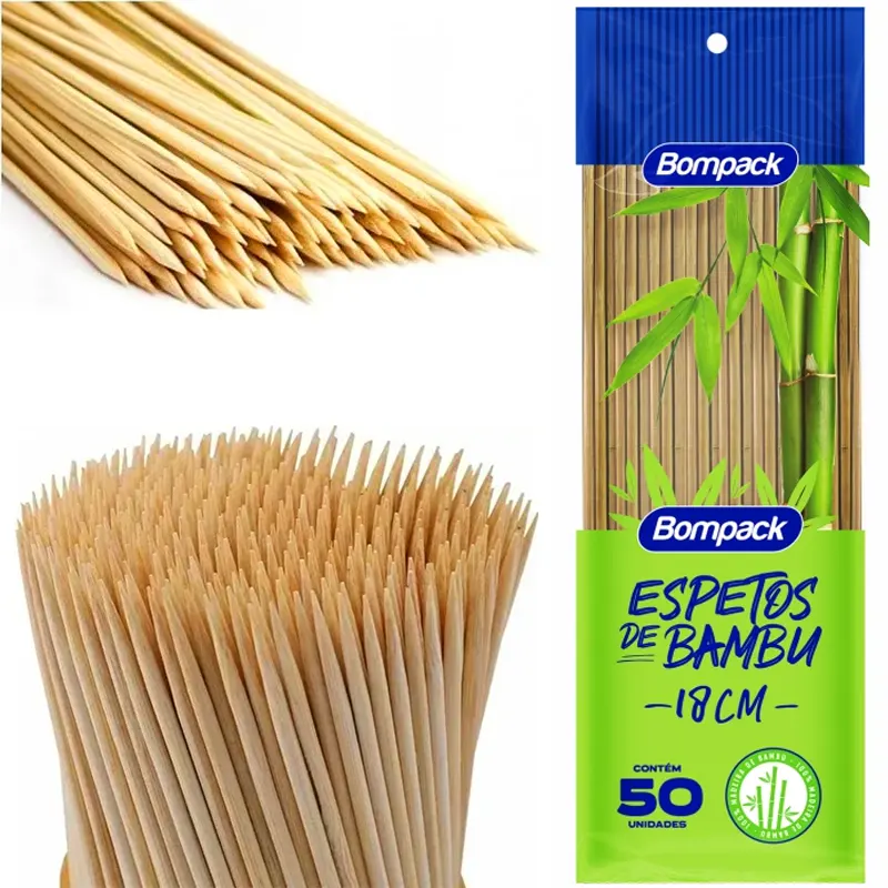Espetinhos de bambu natural da marca Bompack, ideais para churrascos e festas. Disponíveis nos tamanhos 25cm e 30cm, embalagens com 50 unidades ou caixas com 100 pacotes de 50 unidades.