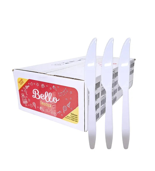 Facas descartáveis em cristal ou cinza, das marcas Bello Festa . Modelos Forte e Refeição Master, disponíveis em pacotes com 50 unidades e caixas com 10 ou 20 pacotes.