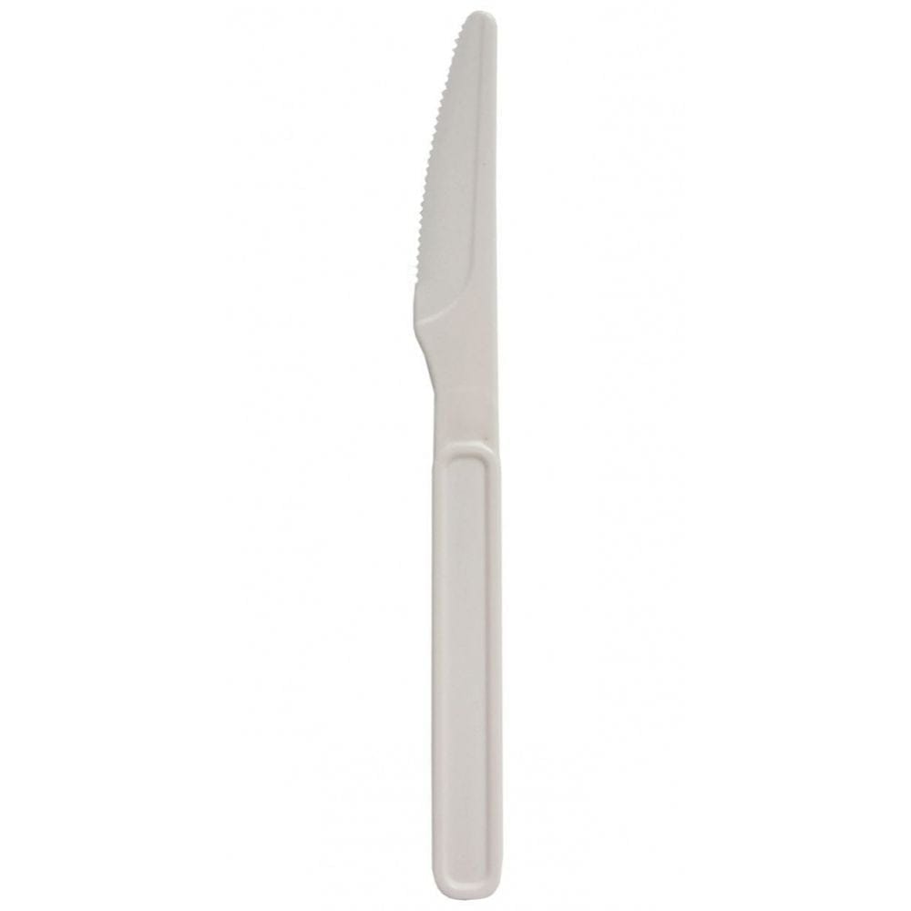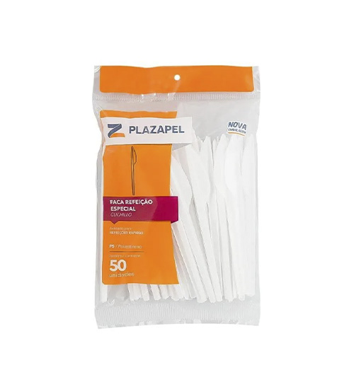 Facas descartáveis em cristal ou cinza. Modelos Forte e Refeição Master, disponíveis em pacotes com 50 unidades e caixas com 10 ou 20 pacotes.