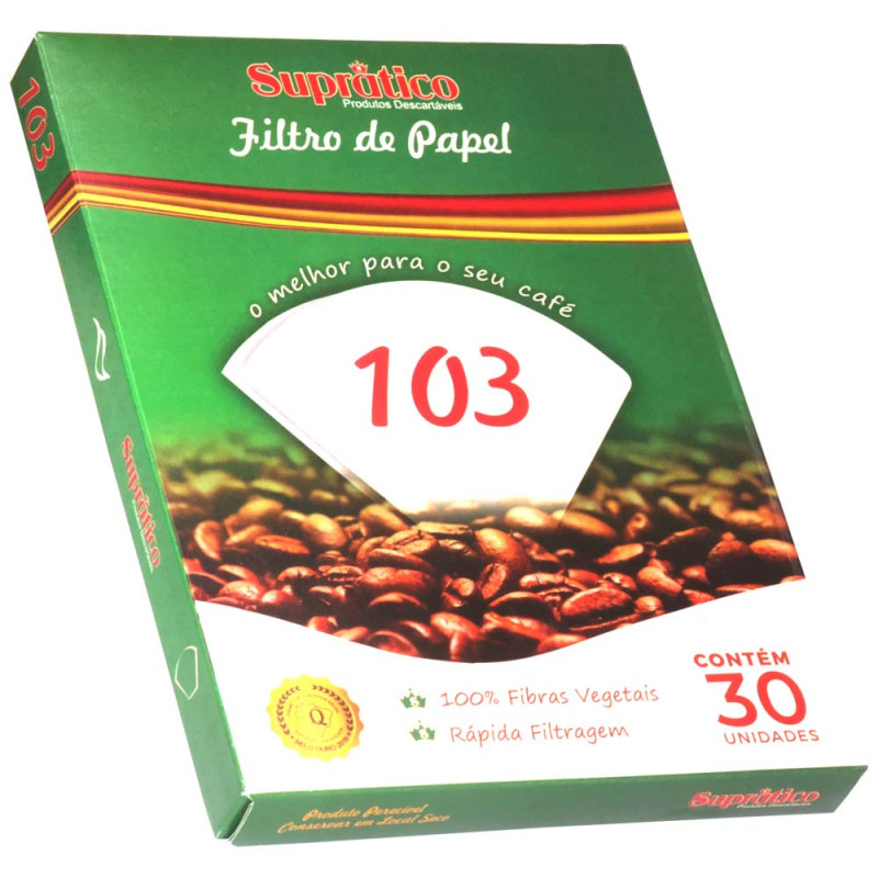 Filtros de papel para café da marca Suprático, tamanhos 102 (pequeno) e 103 (grande). Disponíveis em pacotes com 30 unidades e caixas com 40 pacotes.