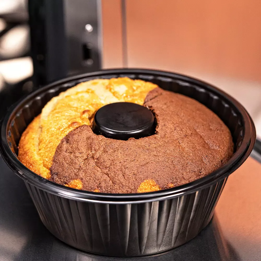 Forma plástica preta para bolos e sobremesas, reutilizável e resistente.