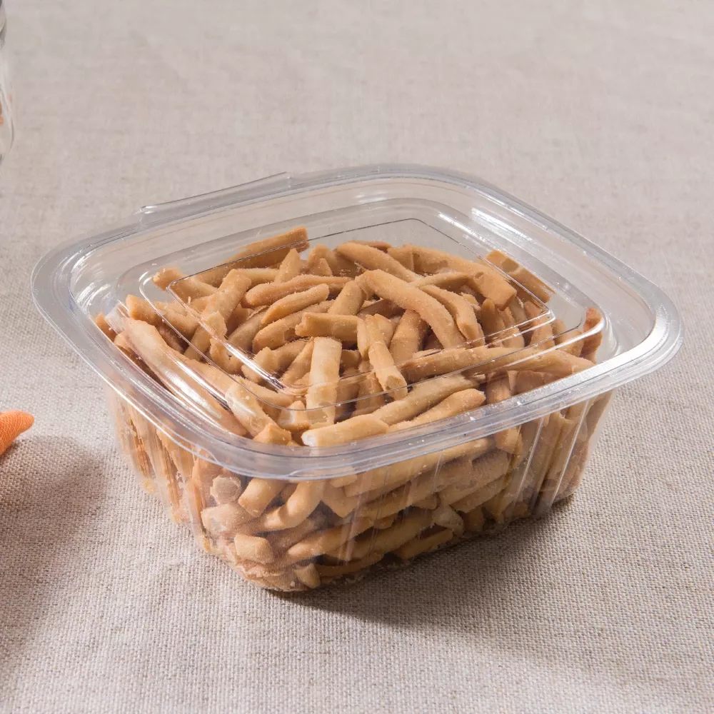Pote retangular transparente ideal para refeições e doces.