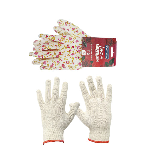 A Luva Bompack é voltada para atividades domésticas ou de manutenção. O modelo de Jardinagem protege as mãos do contato com a terra e plantas, enquanto a Tricotada oferece proteção básica contra abrasão leve no manuseio de objetos. Variações: Jardinagem Flor Tam M (PCT PAR / CX 144×01) | Tricotada Bege Tam G (PCT PAR / CX 144×01).