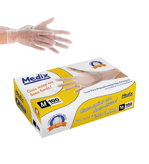 Luva de procedimento Medix, vinil sem pó. Disponível nos tamanhos G, M e P. Vendida em caixas com 100 unidades.