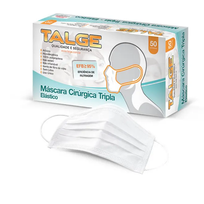 Máscara descartável de proteção tripla camada da marca Talge. Pacote com 50 unidades.