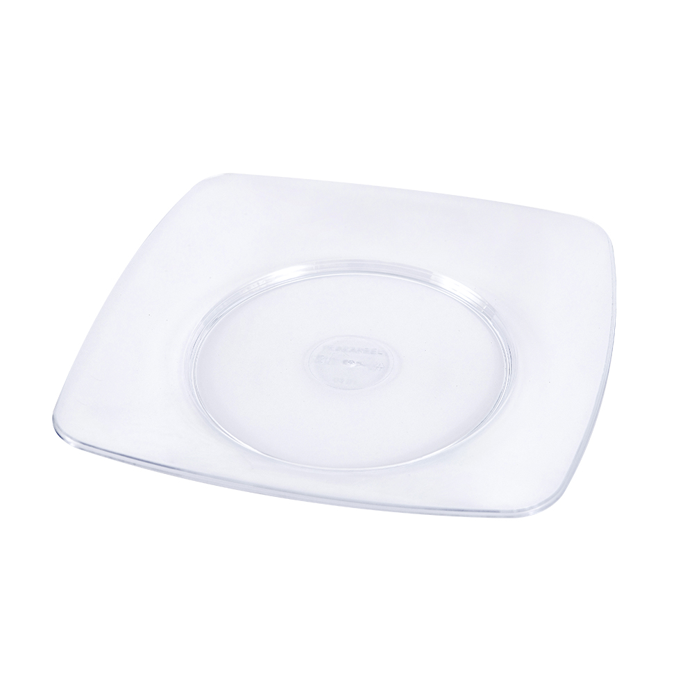 Prato descartável quadrado Plazapel, 15cm, cor cristal. Ideal para sobremesas e festas. Disponível em pacote ou caixa.