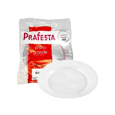 Prato descartável redondo da marca Prafesta. Disponível nos tamanhos Grande e Médio, vendidos em pacotes ou caixas.