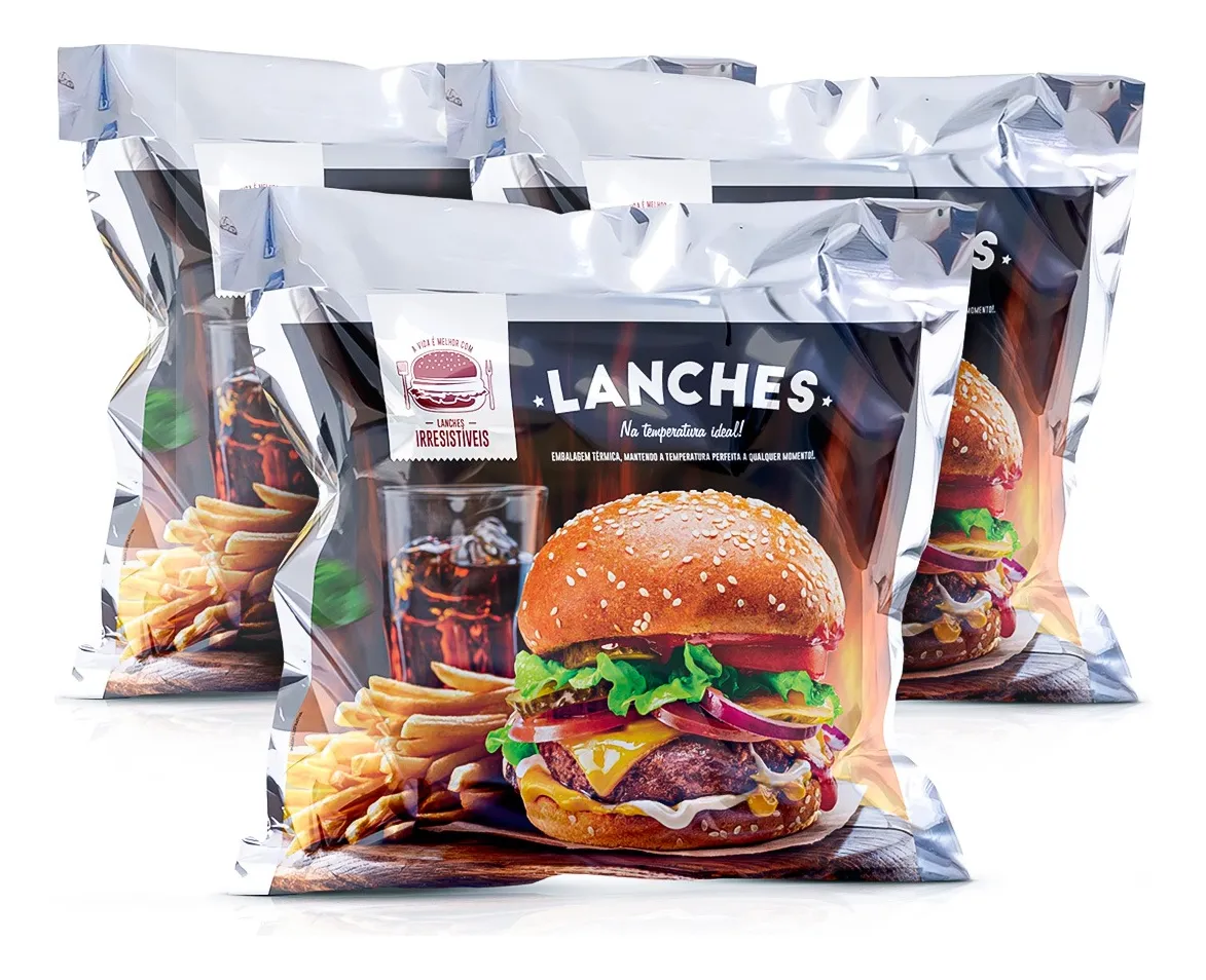 Saco térmico de alumínio com fecho adesivo, ideal para delivery. Vendido em pacotes.